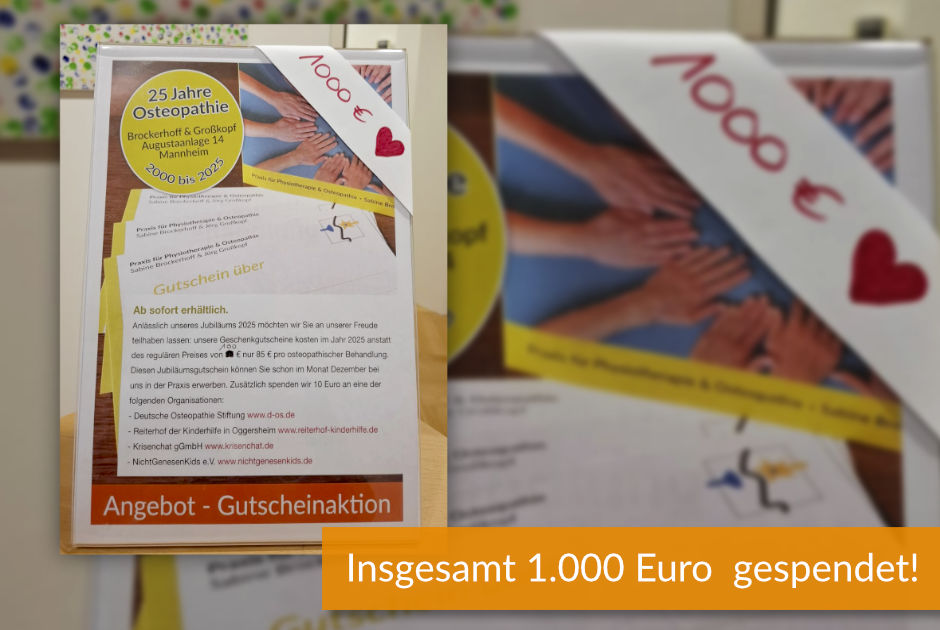Unsere Geschenkgutscheine kostete im Jahr 2025 anstatt des regulären Preises von 100 € nur 85 € pro osteopathischer Behandlung. Zusätzlich spendeten wir 10 Euro an eine der folgenden Organisationen: